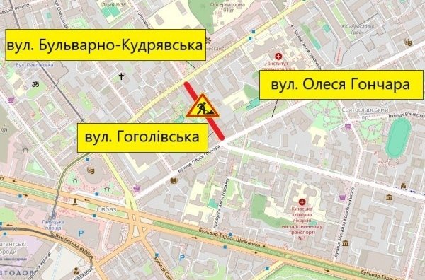 27 липня, із 8:00 до 17:00, частково обмежуватимуть рух вулицею Гоголівською на ділянці від вулиці Олеся Гончара до вулиці Бульварно-Кудрявської. Про це повідомляють у КК «Київавтодор».