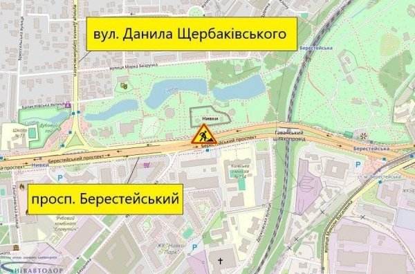 2 серпня, з 8:00 до 17:00, частково обмежуватимуть рух ділянкою Берестейського проспекту у напрямку на виїзд із міста біля зупинки громадського транспорту «Парк Нивки». Про це повідомляють у КК «Київавтодор».