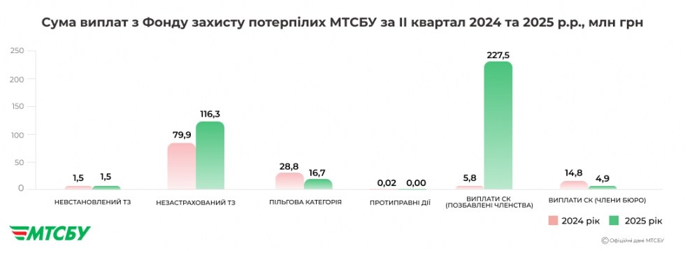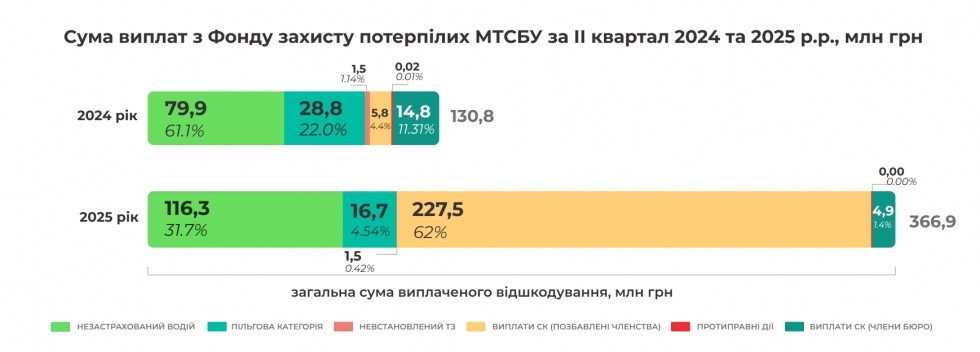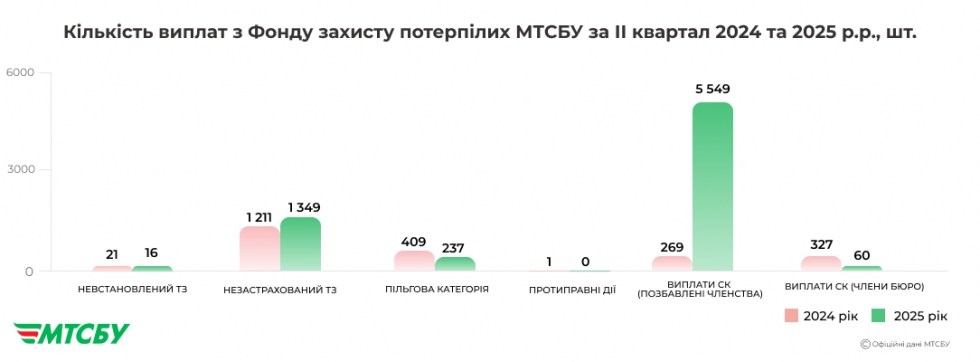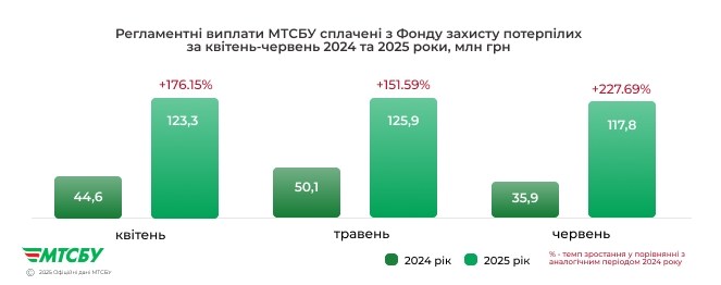 За другий квартал 2025 року МТСБУ здійснило 7 211 регламентних виплат із Фонду захисту потерпілих на загальну суму 366,9 млн грн. У порівнянні з аналогічним періодом 2024 року кількість виплат зросла на 222%, а обсяг виплачених коштів - на 180%.
