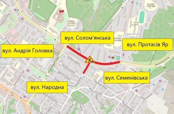 Також у цей час обмежуватимуть рух транспорту на вул. Народній - від вул. Солом'янської до вул. Семенівської.