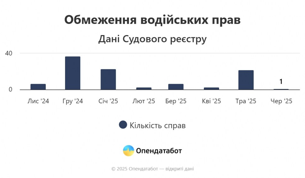 У січні 2025 року суд вперше задовольнив позов ТЦК та позбавив водія можливості кермувати авто, проте таких рішень побільшало. Наразі 9 водіїв тимчасово обмежили у праві керування транспортними засобами через порушення правил військового обліку - допоки вони не виконають вимоги ТЦК або ж як ця вимога не буде відкликана.