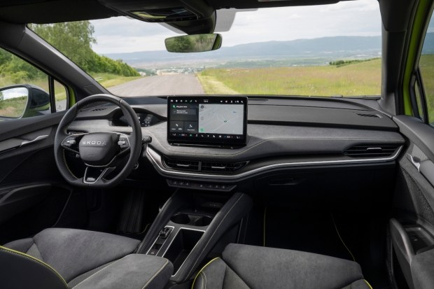 Інтер'єр Skoda Elroq RS характеризується ексклюзивним дизайном Selection RS Lounge, який переважно чорний. Він має оббивку з мікрофібри Suedia з контрастною лаймово-зеленою строчкою та декор під карбон. Триспицеве спортивне кермо з підігрівом обтягнуте перфорованою шкірою. Воно також має лаймово-зелену строчку та емблему RS. Підігрів передніх спортивних сидінь з інтегрованими підголівниками та накладками на педалі з нержавіючої сталі доповнює динамічний вигляд інтер'єру. Водійське сидіння має електрорегулювання та стандартно пропонує функції масажу та пам'яті, а також поперекову підтримку. Додатковий пакет Maxx пропонує ті ж опції і для сидіння переднього пасажира. 3-зонний кондиціонер Climatronic також входить до цього пакету обладнання. Механічні сонцезахисні шторки для задніх бічних вікон включені до додаткового пакету Advanced.