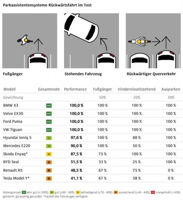 Найкраще себе показали BMW X3, Volvo EX30, Ford Puma та Volkswagen Tiguan, які змогли впоратися з усіма трьома сценаріями без жодних зауважень. Hyundai IONIQ 5, Mercedes-Benz E-Class та Skoda Enyaq виконали завдання частково, продемонструвавши надійність лише у двох випадках із трьох. У Skoda Enyaq, зокрема, система не завжди виявляла манекен-пішохода.