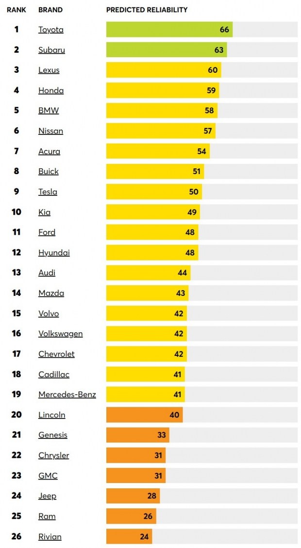 Найбільш проблемними визнали Ram та Rivian. А от Tesla, яка раніше також була внизу рейтингу, несподівано піднялася на 9 місце.