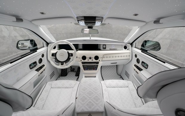 Салон також зазнав серйозних змін. Інтер'єр виконано з білої шкіри з чорним кантом, доповненої чорними та бежевими декоративними елементами. На сидіннях, дверних картах, центральному тунелі та інших деталях інтер'єру використано оригінальний геометричний візерунок, що підкреслює індивідуальний характер проєкту. У задній частині салону замість традиційного дивана встановлено два окремі крісла, розділені великою центральною консоллю.