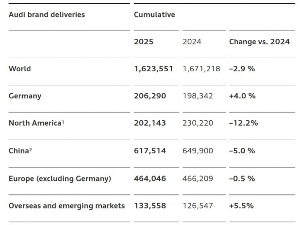 У 2025 році Audi поставила клієнтам по всьому світу понад 1,6 млн. автомобілів, що приблизно на 3% менше, ніж у попередньому році. Однак, починаючи з вересня, поставки зростали щомісяця з року в рік, що сигналізує про тенденцію до зростання. Портфелі замовлень підтверджують цю тенденцію: минулого року замовлення зросли більш ніж на 13% порівняно з 2024 роком, замовлення на електричні моделі підскочили приблизно на 58%. Поставки повністю електричних моделей досягли рекордних понад 223 000 одиниць у 2025 році, що приблизно на 36% більше минулорічних.
