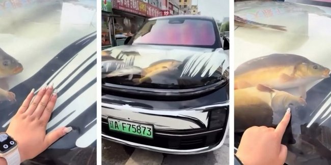 Закритий простір заповнено водою, і всередину помістили кілька великих риб. В епоху штучного інтелекту може здатись, що це фейкові кадри, але велика кількість подібних фото та відео цього авто підтверджують правдивість інциденту. Хоча конструкція виглядає напрочуд цілою, з корпусу можна побачити повільний витік води.