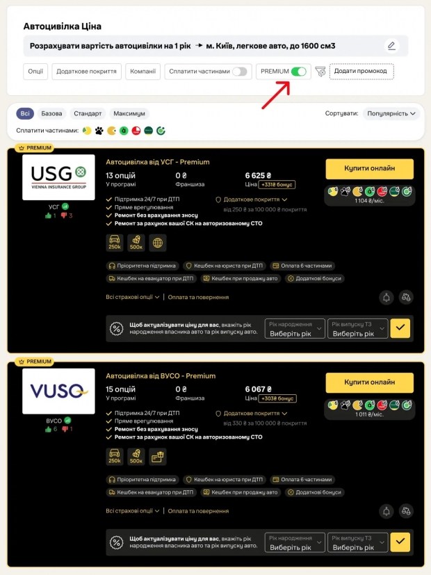 - Вибрати пропозицію з позначкою «Premium», наприклад автоцивілку від страхової компанії ВУСО або УСГ.