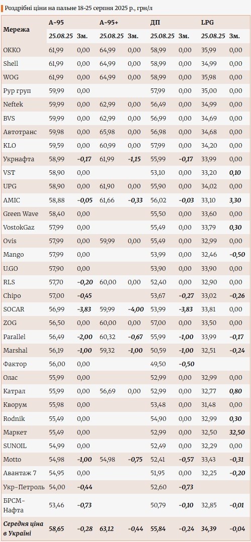 Згідно з моніторингом Консалтингової групи «А-95», за тиждень з 18 по 25 серпня середня вартість бензину марки А-95 зменшилася на 28 коп./л (58,65 грн/л), А-95+ - на 44 коп./л (63,12 грн/л), дизельного пального - на 24 коп./л (55,84 грн/л), LPG - на 3 коп./л (34,39 грн/л).