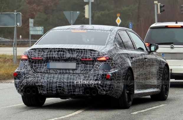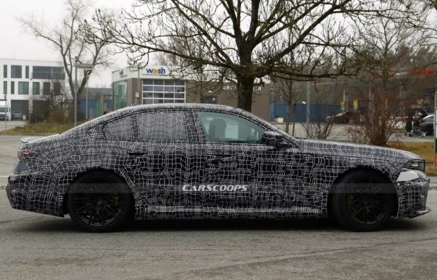 Навіть під камуфляжем M5 легко впізнати. Широкі роздуті крила, масивні пороги, глибокий передній бампер із великими повітрозабірниками та чотири вихлопні труби в задньому дифузорі не залишають сумнівів - це не звичайна «п'ятірка». Перед нами флагманський спортивний седан, який і після фейсліфтингу залишиться максимально агресивним візуально.