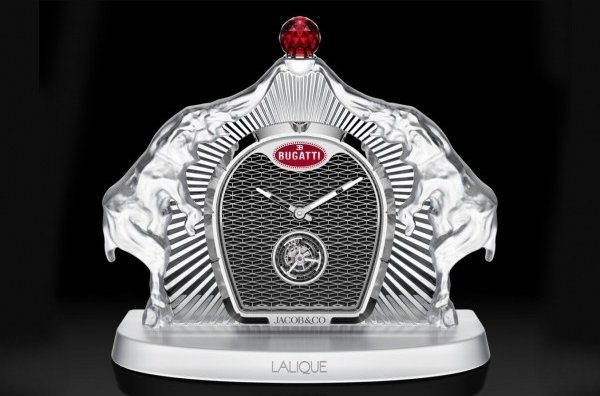 Годинник Calandre - це справжній витвір високої майстерності, де кожен елемент продуманий до дрібниць. Корпус виготовлений з вишуканого хрусталя ручної роботи від французького виробника Lalique, одного з найвідоміших у світі у сфері художнього склярства. У центрі композиції розташований циферблат з полірованої сталі, форма якого наслідує характерну для Bugatti підковоподібну решітку радіатора. Верхню частину годинника увінчує декоративний елемент у вигляді червоного кристалу з 288 гранями, який слугує відсиланням до ювелірної майстерності Jacob & Co та фірмової технології огранки дорогоцінного каміння, що вже давно стала їхньою візитною карткою.
