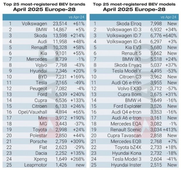 Лідером ринку електромобілів у Європі залишається Volkswagen, який збільшив продажі на 61%. Чеський бренд Skoda збільшив продажі втричі і посів у квітні третє місце після BMW.