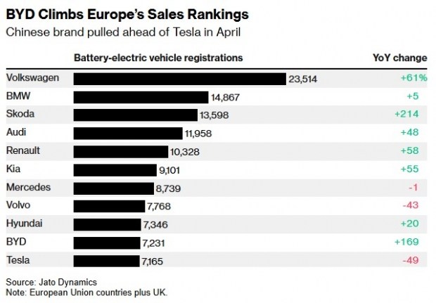 За даними автомобільної аналітичної платформи Jato Dynamics, у квітні BYD продав 7231 новий електромобіль у Європі - це на 169% більше, ніж рік тому. Такий результат дав змогу BYD увійти до першої десятки брендів за продажами електромобілів у Європі.