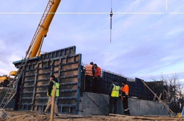 Нині будівельники монтують опалубки шафової стінки та відкрилків першої опори. Проводять піскоструменеву обробку металевих конструкцій з третьої до дев'ятої опор. Ґрунтують та фарбують опори.
