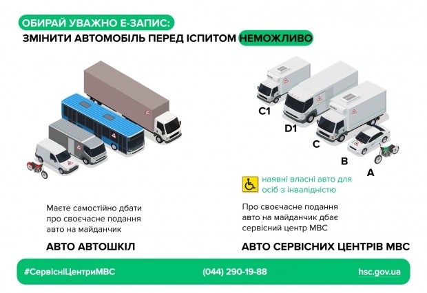 - автошколи (необхідно самостійно домовлятись про можливість орендувати авто для іспиту і воно має бути вчасно подано на майданчик).