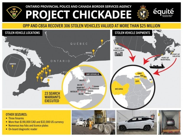 У рамках скоординованої дії під назвою Project CHICKADEE було повернуто 306 транспортних засобів загальною вартістю близько 25 мільйонів доларів, пише Carscoops. Операцію очолювала поліція провінції Онтаріо (OPP), залучивши до співпраці декілька федеральних структур.