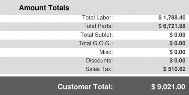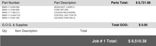 У результаті навіть невелика несправність перетворюється на дуже дорогий ремонт. Вартість нової фари склала близько 6721 долар (приблизно 292 тис. грн.). До цього додається робота майстрів у 1788 доларів й підсумку повна вартість ремонту однієї фари досягла 9021 долара, тобто приблизно 392 000 гривень. І це - лише за один блок фари.