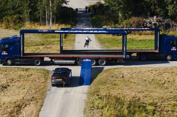 Велосипедист проскочив між двома вантажівками, що рухалися22 листопада 2025Велосипедист на гірському байку перестрибнув між двома автономними вантажівками Scania, що рухалися назустріч одна одній в автономному режимі без водіїв зі зсунутими боковими тентами.