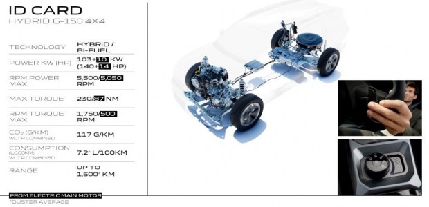 Кросовери Duster і Bigster отримали нову унікальну силову установку hybrid-G 150 4x4, яка поєднує гібридну технологію, повний привод і можливість роботи на LPG. Система складається 1,2-літрового бензинового двигуна потужністю 140 к.с., електромотора на задній осі потужністю 31 к.с. й 48-вольтової батареї на 0,84 кВт-год.