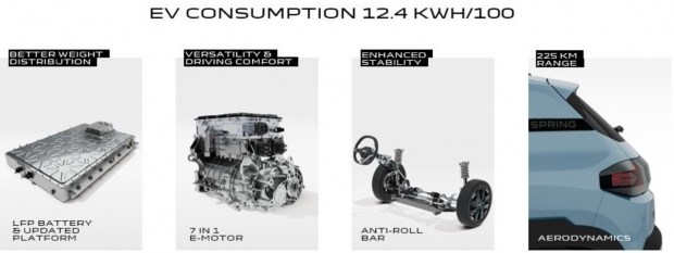 Компактний електромобіль Spring отримав нову батарею 24,3 кВт-год із покращеною структурною інтеграцією та модернізовану платформу. Кузов став жорсткішим, а баланс мас оптимізували. Модель оснащена новими електродвигунами потужністю 70 або 100 к.с., що забезпечують до 20% більше тяги на швидкостях 80-120 км/год. Запас ходу становить 225 км за циклом WLTP, а середнє споживання енергії знизилося до 12,4 кВт-год/100 км. Також покращено аеродинаміку та встановлено стабілізатор поперечної стійкості.