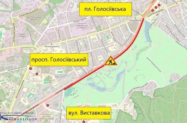 Обмеження пов'язані з ремонтом тротуару на ділянці проспекту від Голосіївської площі до вулиці Виставкової.