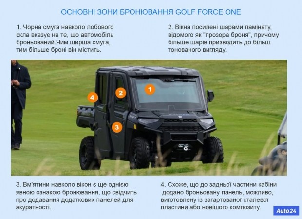 Експерт ідентифікував цю модель як Polaris Ranger XP і повідомив, що ця машинка Трампа розроблена таким чином, щоб забезпечити пасажиру максимальний захист, залишаючись при цьому достатньо легкою, щоб не пошкодити поле гольфу.