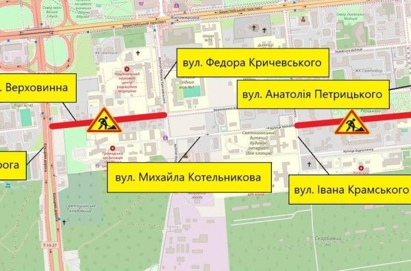 15-22 листопада частково обмежуватимуть рух вулицями Верховинною та Михайла Котельникова14 листопада 2025Дорожники проводитимуть поточний ремонт асфальтобетонного покриття на ділянці від Кільцевої дороги до вул. Федора Кричевського та на ділянці від вул. Івана Крамського до вул. Анатолія Петрицького.