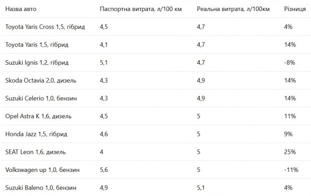 У більшості автомобілів витрата пального на стенді виявилася більша за паспортні показники, проте Volkswagen up та Suzuki Ignis у тесті були економічнішими.