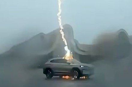 Одразу три блискавки вдарили в одне місце в Китаї. Вони влучили в електромобіль BYD Song Plus, проте він витримав удар і не постраждав.
