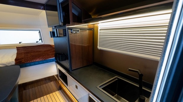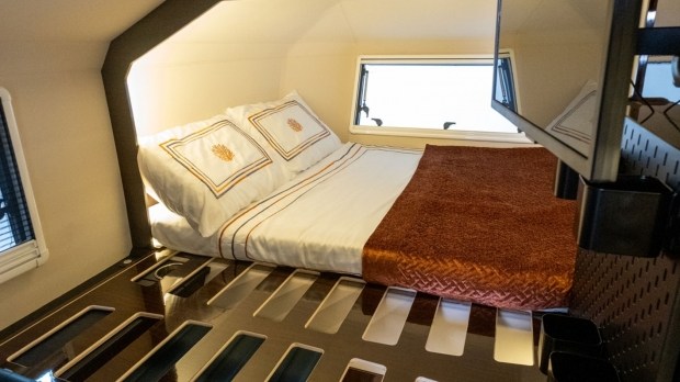 Усередині знайшлося місце для двоспального ліжка, столу, шаф та телевізора. Також є компактна кухня із раковиною, холодильником та мікрохвильовою піччю.
