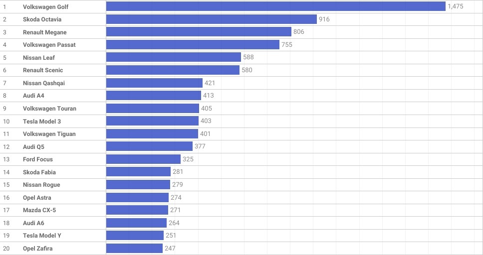 На друге місце із четвертого піднялася вживана Skoda Octavia (916 шт.). Третю сходинку утримує Renault Megane (806 шт.), а на четверте місце з другого опустився Volkswagen Passat (755 шт.), котрий колись багато років очолював рейтинг «свіжопригнаних» авто.