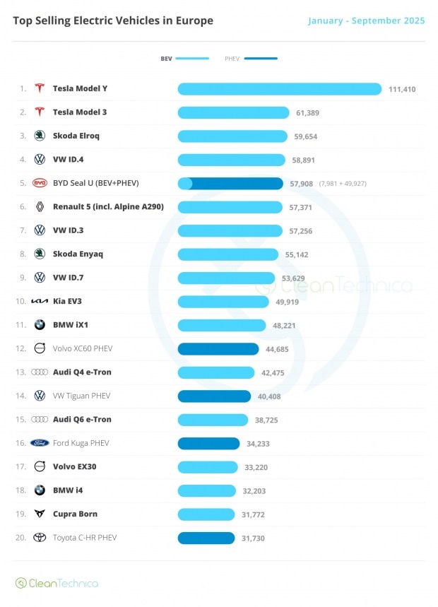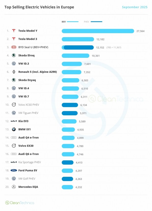На ринку моделей вересень запам'ятався домінуванням Tesla, якій вдалося одночасно зайняти перше та друге місця в загальноєвропейському рейтингу електромобілів. Лідером став кросовер Tesla Model Y з результатом приблизно 27,5 тисяч проданих авто. Другою стала Tesla Model 3, яка завершила місяць із понад 12 тисячами реєстрацій. Одразу за ними, з майже ідентичним результатом, розташувався BYD Seal U - модель, яка активно закріплюється в Європі завдяки поєднанню привабливої ціни та адаптивності формату, особливо у версії з плагін-гібридною силовою установкою. У цій категорії конкуренція стає все гострішою, і поява сильних гравців із Китаю вже відчутно змінює ринковий баланс.