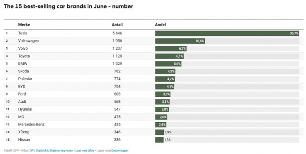 Електромобілі впевнено домінують у Норвегії. Згідно з даними Норвезької адміністрації автомобільних доріг (OFV), у червні 2025 року в країні було зареєстровано 17 799 нових електрокарів з 18 376 загальних нових реєстрацій. Таким чином, частка EV склала рекордні 96,9%.