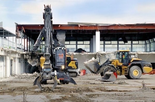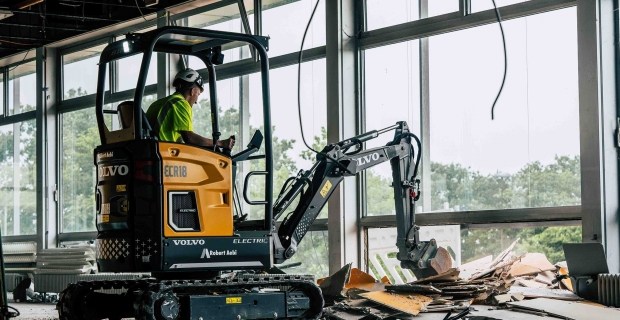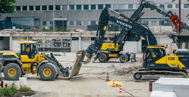 На міському знесенні будівлі працювали електричні вантажівки та важка техніка Volvo Group. Тож звук від роботи техніки на розбиранні гігантського корпусу був мінімальний.