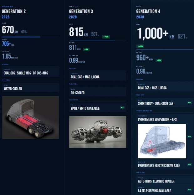 Наступний крок - четверте покоління, яке очікується у 2030 році. Такі вантажівки оснащуватимуть акумуляторами місткістю понад 960 кВт-год, що дозволить перевищити позначку в 1000 км запасу ходу.