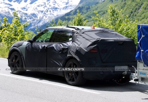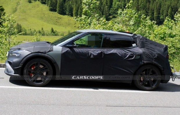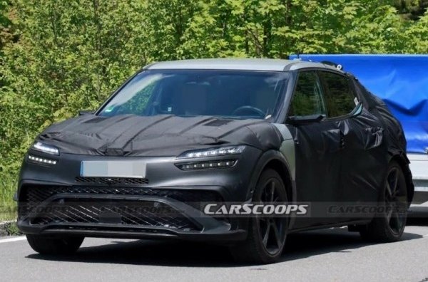Передня частина кросовера виконана в агресивному стилі й надихається формами концептуального купе Genesis X Gran Berlinetta Vision Gran Turismo. Тут виділяється масивний передній бампер з великим центральним повітрозабірником і потужним спліттером, три додаткові вентиляційні отвори вище та ще три овальні прорізи на капоті, що підкреслюють спортивний характер автомобіля. Через камуфляж також вдалося розгледіти невеликі аеродинамічні накладки на передніх крилах, які, ймовірно, покращують притискну силу на високих швидкостях.