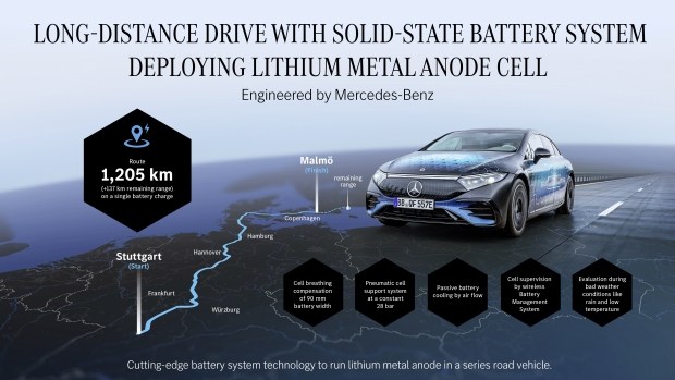 Після оголошення про дорожні випробування в лютому, поїздка зі Штутгарта (Німеччина) до Мальме (Швеція) була частиною комплексної програми валідації технології твердотільних акумуляторів компанії Mercedes-Benz. Окрім цифрового моделювання та випробувань на сучасних об'єктах у Штутгарті-Унтертюркгаймі та Зіндельфінгені, автомобіль та акумулятор проходять випробування в реальних умовах на дорогах загального користування. Мета полягає в тому, щоб оцінити загальну продуктивність автомобіля в різних кліматичних зонах та профілях маршрутів, а також пришвидшити шлях до серійного виробництва. Нещодавня поїздка до Мальме додає до цієї програми випробувань реальний сценарій довгої подорожі.