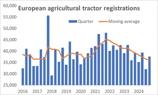 Зниження рівня реєстрацій у 2024 році відображає нижчий рівень попиту на трактори з боку європейських фермерів і виробників. Це тісно переплітається з падінням доходів фермерів. Ціни на більшість сільськогосподарських товарів значно знизилися після різкого зростання у 2022 році, тобто після вторгнення Росії в Україну.