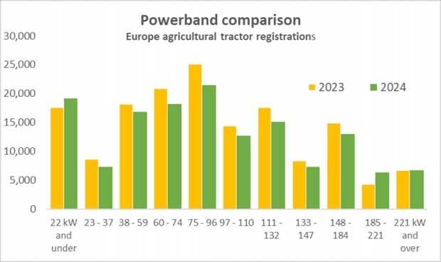 У 2024 році було зареєстровано майже на 20% більше тракторів із потужністю понад 185 кВт (приблизно 250 к.с.), порівняно з роком раніше. Ці більші машини все ще становлять лише 9% від загальної кількості в Європі, але це значно більше, ніж частка 7% у 2023 році.