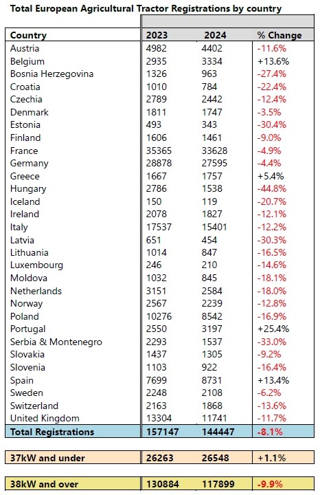 З 1 січня по 31 грудня 2024 року в Європі зареєстровано 204 500 тракторів. У цій кількості 144 400 транспортних засобів є сільськогосподарськими тракторами, з яких 26 500 одиниць (18%) мали потужністю 37 кВт (50 к.с.) і менше, а 117 900 (82%) - потужність 38 кВт і більше.