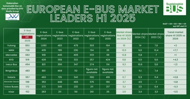 На європейському ринку акмуляторних електробусів, як і раніше, лідирує Yutong - з 852 реєстраціями та часткою ринку в 16% порівняно з 14% за той же період 2024 року. MAN слідує за ним із 708 одиницями - це на 60% більше, ніж за весь 2024 рік (435). Таким чином, частка MAN становить 13,3%, що є значним зростанням порівняно з 5,6% у 2024 році та помітним відновленням після падіння, зафіксованого минулого року.
