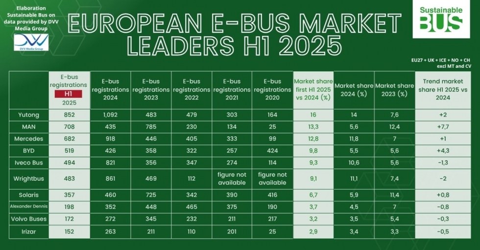 У першій половині 2025 року кількість зареєстрованих автобусів Wrightbus досягла 483 од., що скоротило частку ринку з 11,1% до 9,1%. Solaris зареєстрував 357 автобусів на акумуляторних батареях, що відповідає частці 6,7% - порівняно з 5,9% 2024 року, але значно нижчій за частку 2023 року, що перевищує 11%. Однак слід також враховувати домінування польського виробника в сегменті автобусів на паливних елементах, де було зареєстровано 163 автобуси.