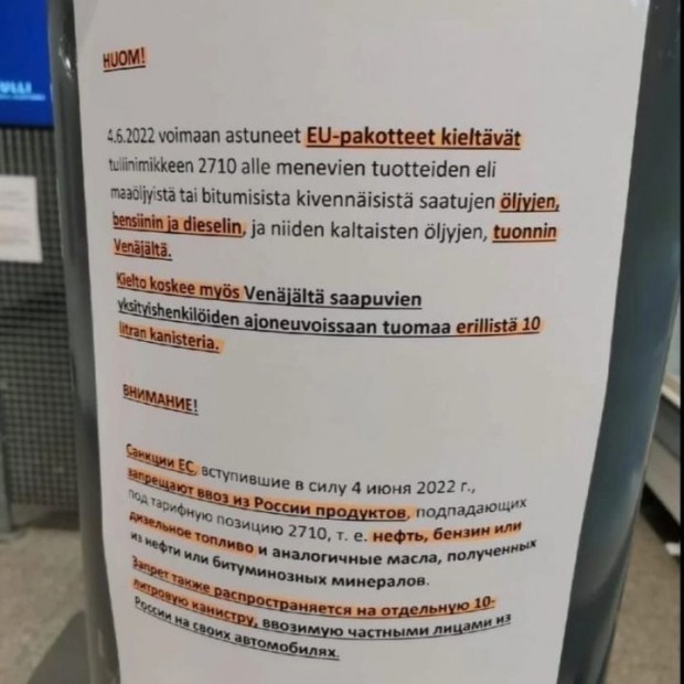 Зазначається, що санкції ЄС забороняють імпорт бензину із росії в Фінляндію. Тепер ця заборона поширилася і на ввезення пального приватними особами у каністрах.