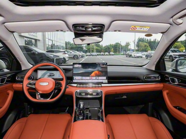 Інтер'єр нового Emgrand також зазнав глибоких змін. У салоні переважають м'які оздоблювальні матеріали, а декоративні елементи з хромованим покриттям надають відчуття сучасної розкоші. Вперше в моделі використано кришталевий селектор трансмісії та прозорі верхні підсвітки. Центральна консоль оснащена 14,6-дюймовим широкоформатним сенсорним екраном мультимедійної системи Flyme Auto, створеної у співпраці з Meizu. Вона забезпечує швидке реагування, інтуїтивне керування та підтримує голосові команди. Під екраном залишилися фізичні кнопки для найважливіших функцій, що спрощує користування під час руху.
