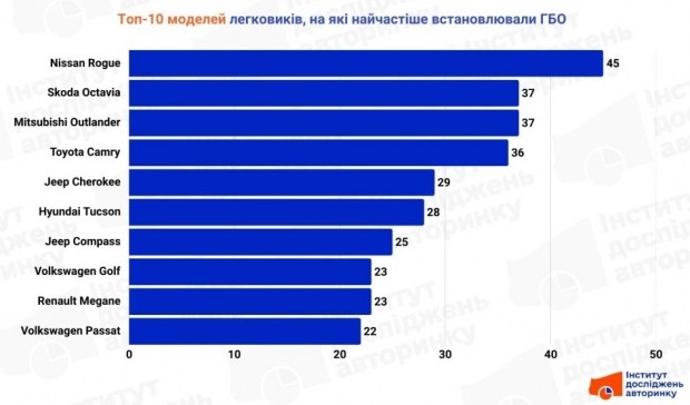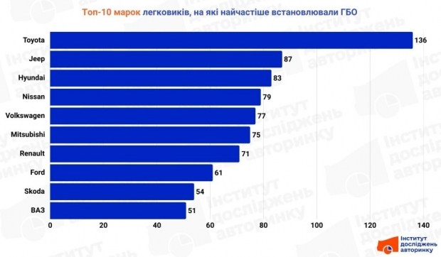 Серед марок, на яких найчастіше з'являлося газобалонне обладнання, номер один у списку Toyota. Цей виробник не поспішає займати своє місце серед електромобілів, модернізувати перевірені чималим часом двигуни внутрішнього згорання (як і чимало інших елементів конструкцій своїх авто), тому серед моделей цього японського виробника досі є чимало варіантів з двигунами без прямого впорскування бензину й турбонаддуву, на які легко встановити ГБО, як у 80-ті роки минулого століття. Також у верхній частині списку Jepp, Hyundai, Nissan - переважно версії, що прибувають зі США, і теж обладнані «атмосферними» двигунами. Зате ВАЗ, який колись разом з продукцією ЗАЗ/Daewoo очолював цей рейтинг, скоро покине першу десятку - їх стає все менше в обігу, а парк такими, на щастя, більше не поповнюється.