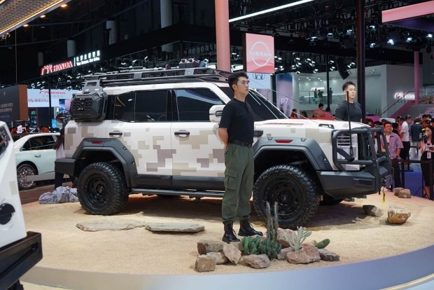 Дизайн новинки поєднує сучасні риси з традиційними китайськими елементами - особливо помітні стилістичні акценти, натхненні технікою «шип-паз» з давньої архітектури. Передня частина автомобіля зберегла фірмову решітку з сімома вертикальними й двома горизонтальними лініями, що візуально підкреслюють потужність і статусність моделі. Світлотехніка - це круглі фари в квадратних корпусах, які додають суворості зовнішньому вигляду. На виставці автомобіль представили у спеціальному камуфляжному забарвленні, а також із цілим набором «експедиційних» опцій: силовими бамперами, захисними канатами, буксирувальними гаками, даховим багажником-платформою, додатковим світловим обладнанням, невеликим заднім контейнером та спеціальними позашляховими шинами типу AT, що значно розширюють можливості авто на складних маршрутах.