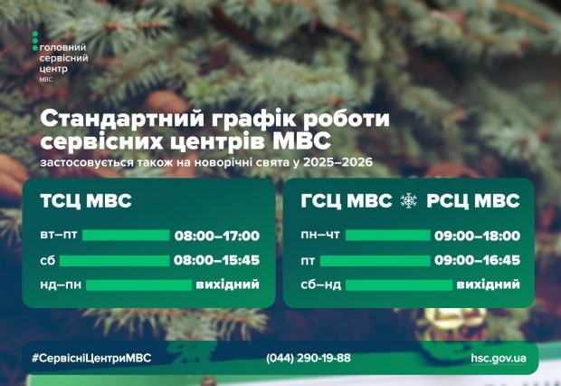 У зв'язку з наближенням зимових свят ми інформуємо про порядок роботи територіальних та регіональних сервісних центрів МВС у період Різдва та Нового року.