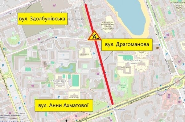 Дорожники КП ШЕУ Дарницького району ремонтуватимуть у цей період дорожнє покриття на ділянці від вул. Анни Ахматової до будинку № 2 на вул. Драгоманова.