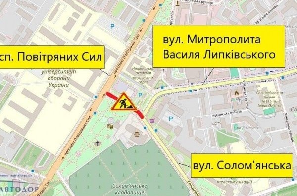 Із 31 липня до 3 серпня, з 21:00 до 5:00, обмежуватимуть рух Солом'янською площею на ділянці від вулиці Солом'янської до проспекту Повітряних Сил та вулиці Митрополита Василя Липківського. Про це повідомляють у КК «Київавтодор».