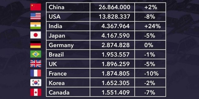 Це, безумовно, найнесподіваніша зміна у ТОП-10. Крім того, вперше в історії Індія зайняла третє місце. Японія зазвичай була ринком номер 3, в основному через величезний попит на доступні кей-кари. Проте японський ринок давно перестав зростати.